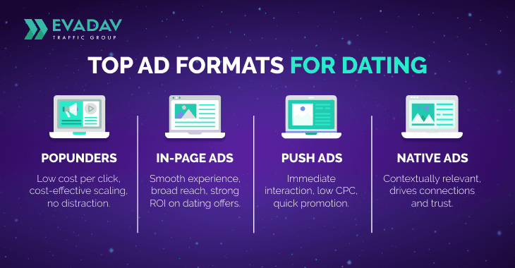 As for ad formats, In-page push notifications are worth trying for dating offers because users are already subscribed to such notifications. Creatives can be designed like a personal message in a chat window, which encourages instant clicks and transitions.