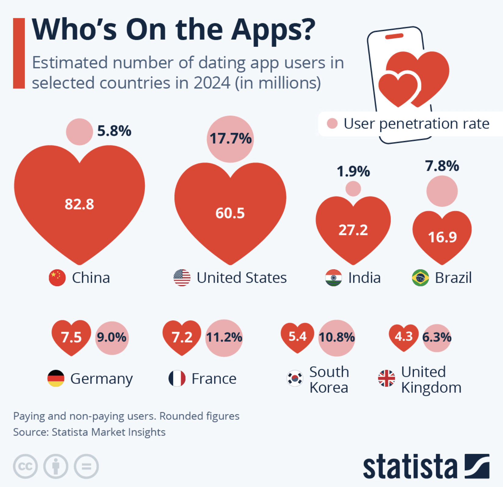 Tinder: ≈Approximately 60 million active users monthly, with user growth in 2024 at 9.6–9.7 million. |