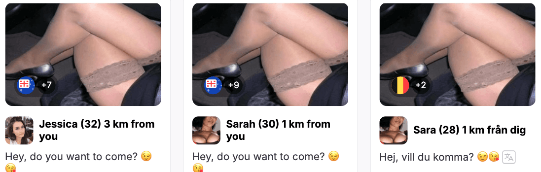 This ad has been running for over a year in different GEOs. Formula: selfie + name + distance filter + greeting in the "chat" = success: