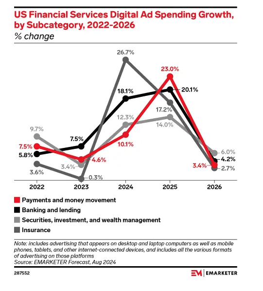 It is expected that digital advertising spending in the USA will increase by 4.3% in 2025 despite economic uncertainty, indicating the overall stability of the advertising market. According to EMARKETER, spending on financial media advertising in the USA will increase by 66.8% in 2025, reaching $1.22 billion, almost doubling the figure for 2024.