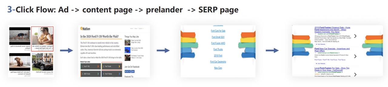 3-Click Flow adds an extra step: the user first reads a short article or sees a themed content page, then clicks a search block within it, and goes through a pre-land before reaching the advertiser. All three models follow the same idea, but the number of steps changes depending on how warm and engaged the user becomes before clicking the final sponsored link. The 3-click flow is most commonly used on Yahoo.