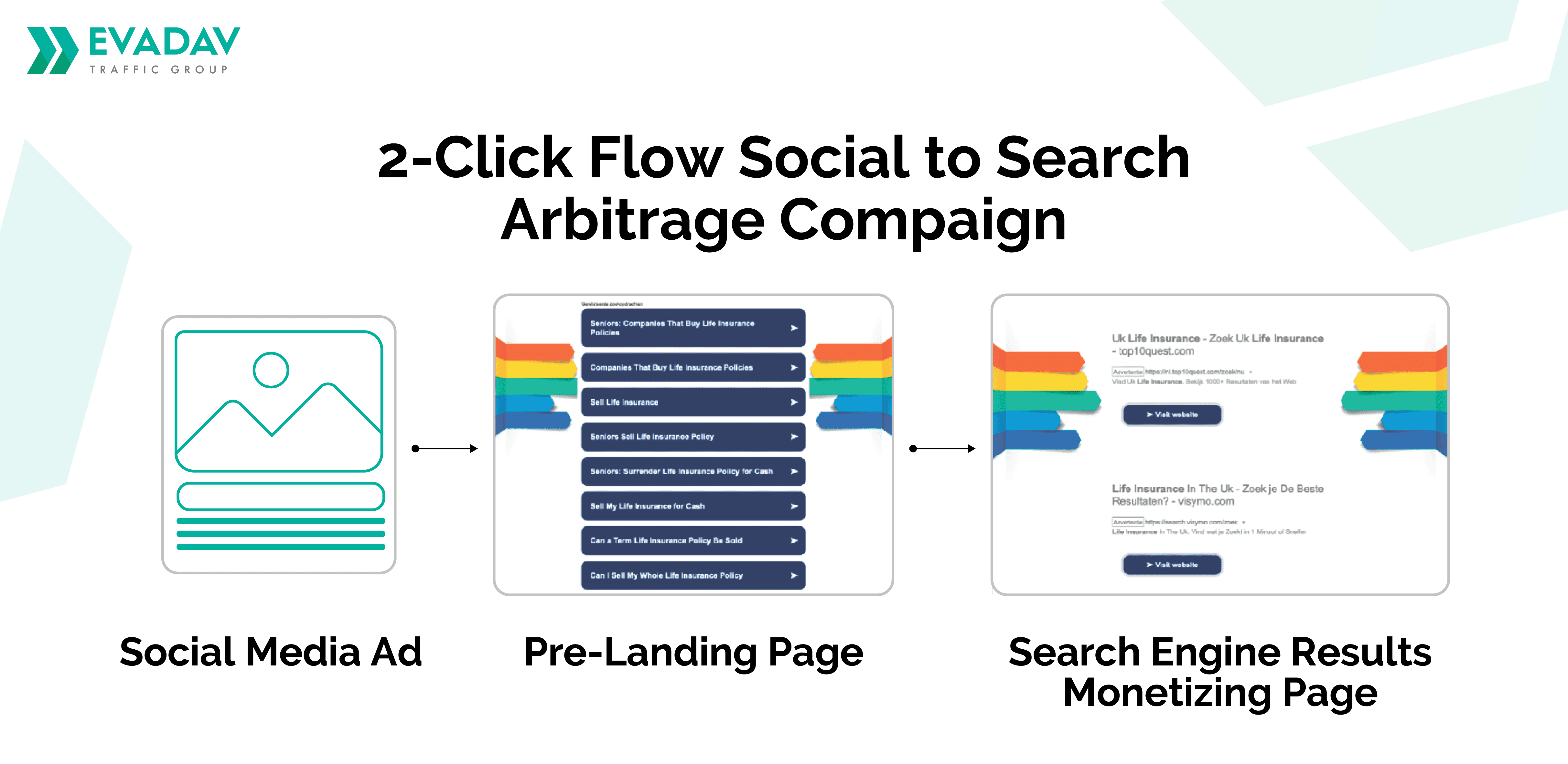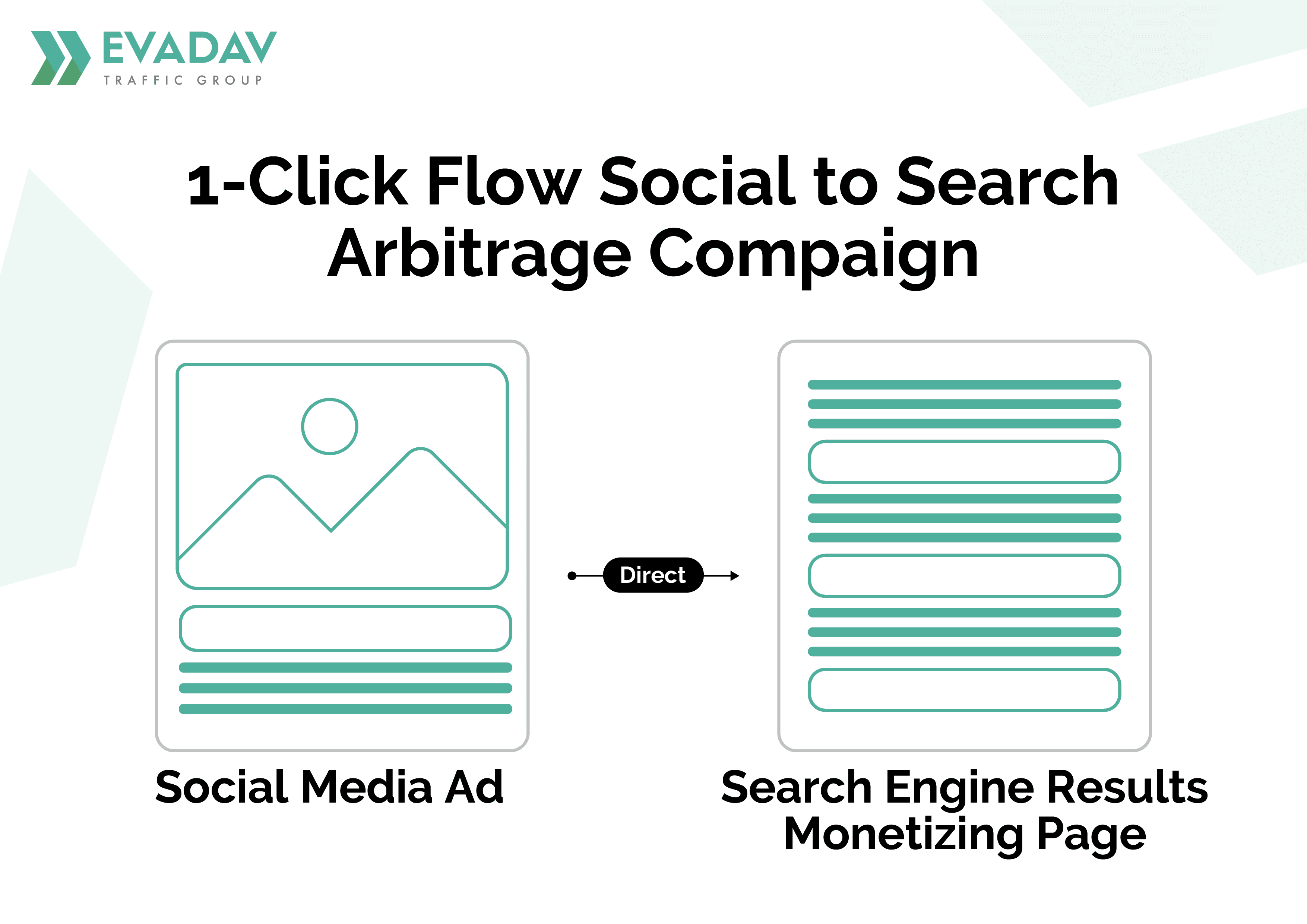 In social to search arbitrage, marketers purchase social media ads (e.g., Facebook, Instagram, TikTok) to drive users to search engines or paid search results. This approach often uses targeted social media campaigns to spark curiosity or interest, prompting users to search for more details or to find related offers.